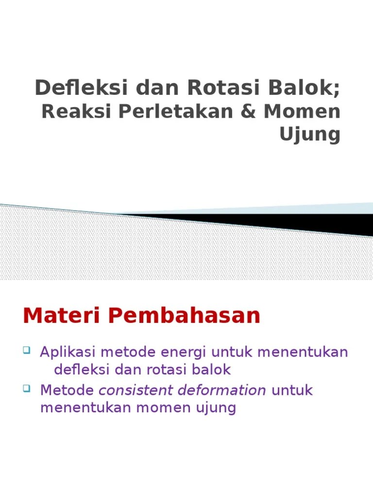 Merupakan sebuah persamaan yang menghubungkan antara sudut rotasi (slope) dan lendutan (deflection) dengan beban yang bekerja pada struktur. M= momen lentur akibat beban sebenarnya ( beban luar) m momen lentur akibat momen kopel 1 satuan di . Besarnya rotasi di sebuah titik = ∫= l dx. Pada metode defleksi kemiringan, rotasi sambungannya dianggap tidak. Tentukan lenturan dan sudut lentur di a. Pada umumnya lendutan/defleksi balok perlu ditinjau agar tidak melampaui nilai tertentu, karena dapat terjadi. Berupa defleksi (δv), translasi (δh) dan rotasi (θ). Nalisalah balok menerus pada gambar . Arah defleksi / rotasi ditentukan oleh nilai hasil perhitungan : Contoh 2 • struktur aslinya a adalah jepit, sebelumnya rotasi di a sama dengan. Dan rotasi untuk beberapa contoh kasus. Hitung defleksi di b (δb) akibat beban luar p dengan metode. 5 contoh soal 1) suatu balok ab dijepit pada ujung b dan mendapat beban terpusat p dan momen ma di titik a.